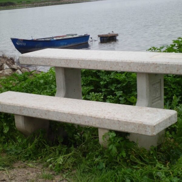 שולחן עם ספסל עשוי בטון אדריכלי עם גימור מוזאיקה