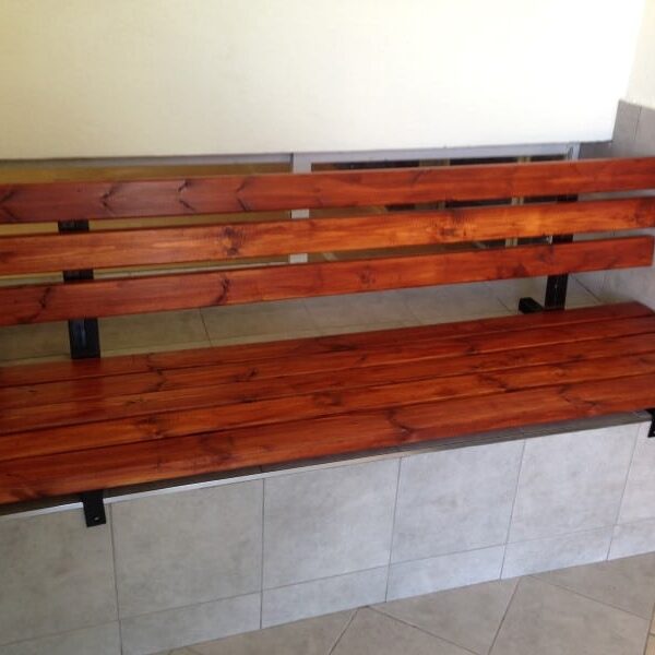 ספסל כפול לשני כיוונים עם משענת גב באמצע, עשוי ברזל ושלבי עץ , ניתן לקבל במידה נצרכת.